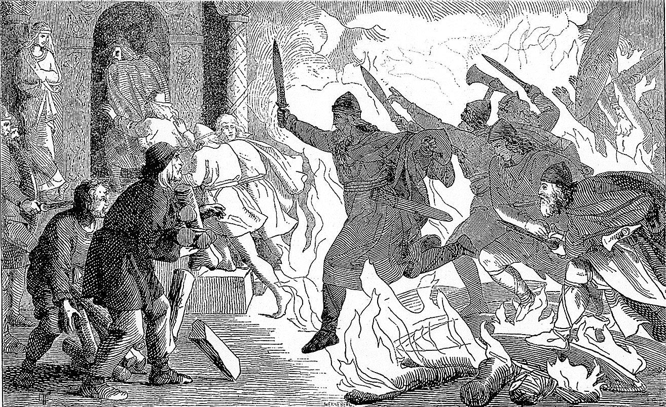 Niels Anker Lund Rolf Krake og hans Mænd bane sig en Vej gennem Baalet i Kong Adils Hal (1868)